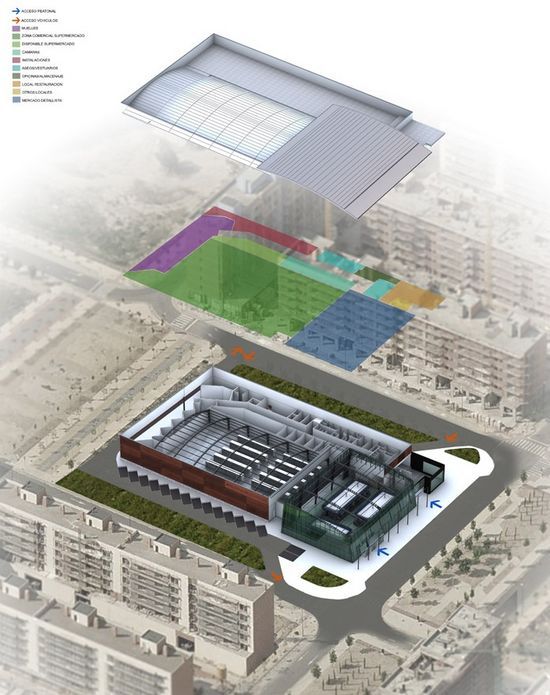 El MERCADO VALDESPARTERA es un ambicioso proyecto municipal realizado en el Ecobarrio Valdespartera de Zaragoza; En dicho espacio comercial se han integrado los servicios del mercado de proximidad con puestos al detalle junto con un gran supermercado, unificando en un único edificio ambas actividades comerciales con el fin de prestar un servicio de más calidad al cliente potencial de este nuevo barrio de la ciudad.
